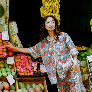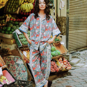 Its ornate print blends scrolling borders, blooming florals, and Mediterranean blues and reds, reminiscent of old-world markets and sun-faded tapestries.