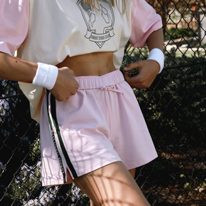 A relaxed drawstring short designed for movement and ease, the Court Short – Pink carries the spirit of Cowboy Tennis Club with understated detail. Cut in a soft, breathable fabric, the silhouette is loose yet refined, finished with practical pockets and a waistband that can be rolled to adjust length while keeping the side stripe uninterrupted.