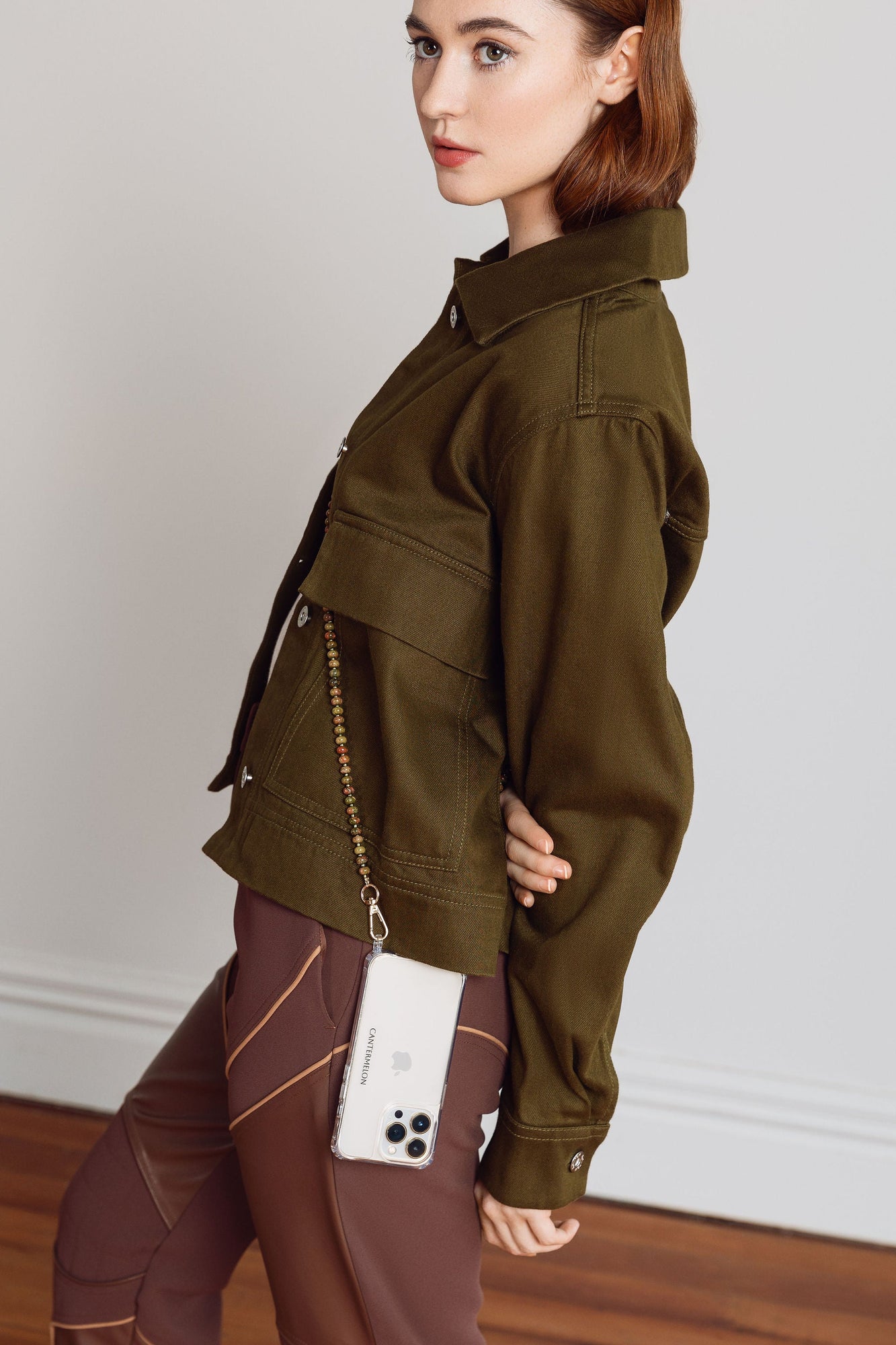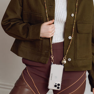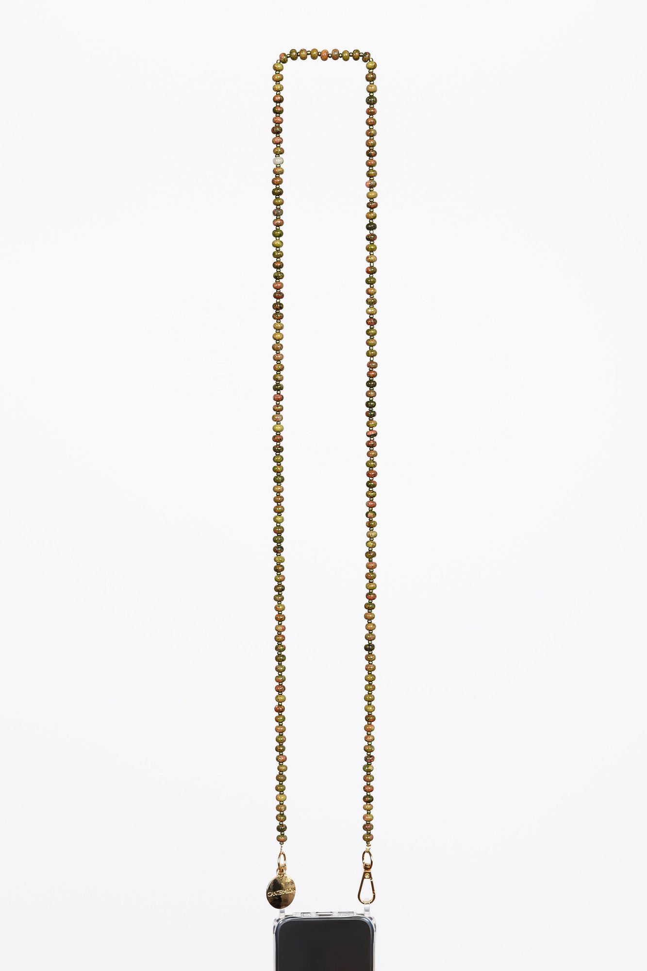 Make like Hilma. Take some shrooms and paint for the gods. Or whatever it is you do when you want to connect with nature. Once you have finished cavorting, this hand assembled unakite stone phone chain will anchor you back to earth. The beautiful brown, green and warm pinkish amber tones of the stone represent the earthly feminine and channel the divine wisdom of the infinite cosmos.