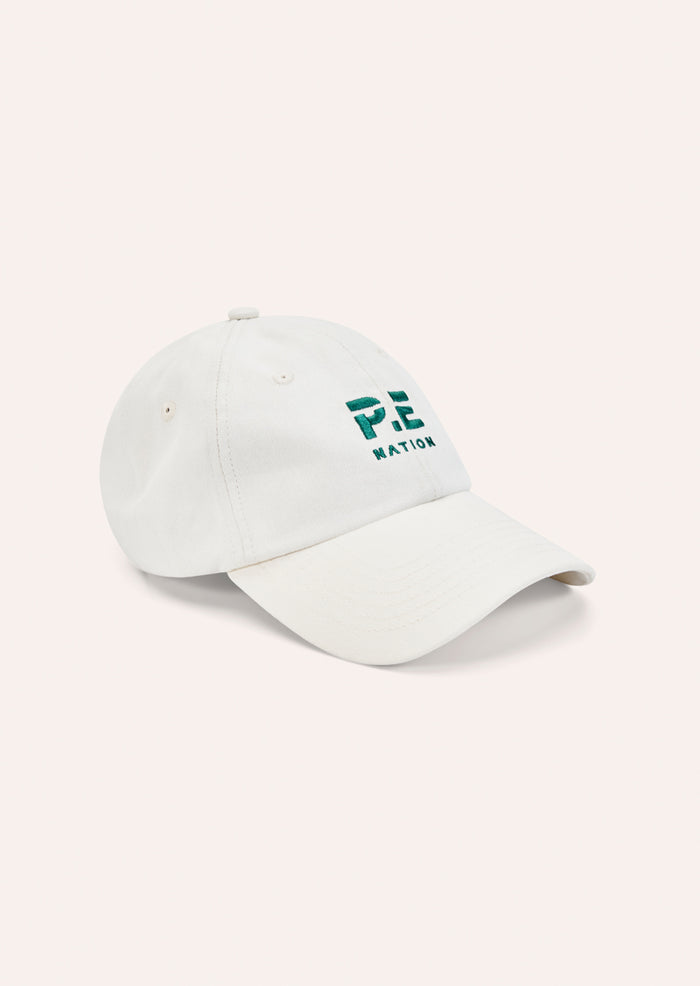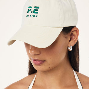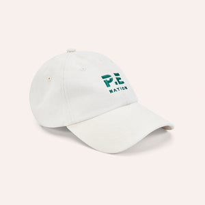The Heads Up Cap in Whisper White & College Green is a 6 panel unstructured cap. This cap is garment dyed for a vintage effect and features an embroidered logo, internal branded taped seams and a metal adjuster at back. Wear this cap on rotation with all your favourite P.E Nation looks.