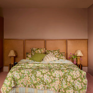Delicate floral linen pillowcases in rich olive green bring a garden-inspired elegance to your bedding. Style with neutral sheets for calm or bold prints for contrast.