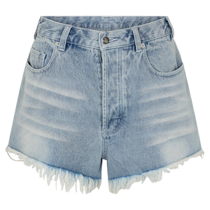The high-rise waist feels easy and secure, while the loose leg and raw, frayed hem give them a carefree, just-cut-off feel.