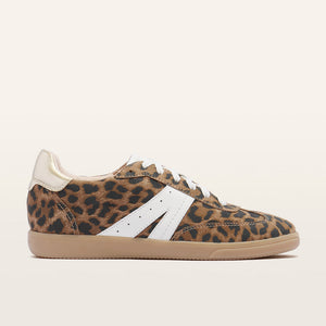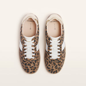 Sole-conscious, style-coded Levi in Leopard Print Suede; more than your average sneaker. This low-profile leopard sneaker features a sleek suede upper with a pop of smooth white leather accents, anchored by a retro-inspired gum sole. Lightweight and comfortable, Levi combines design that nods to iconic styles of the past with a modern twist and a versatile palette, making it a standout among neutral sneakers for any wardrobe.