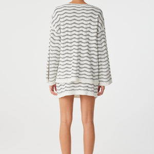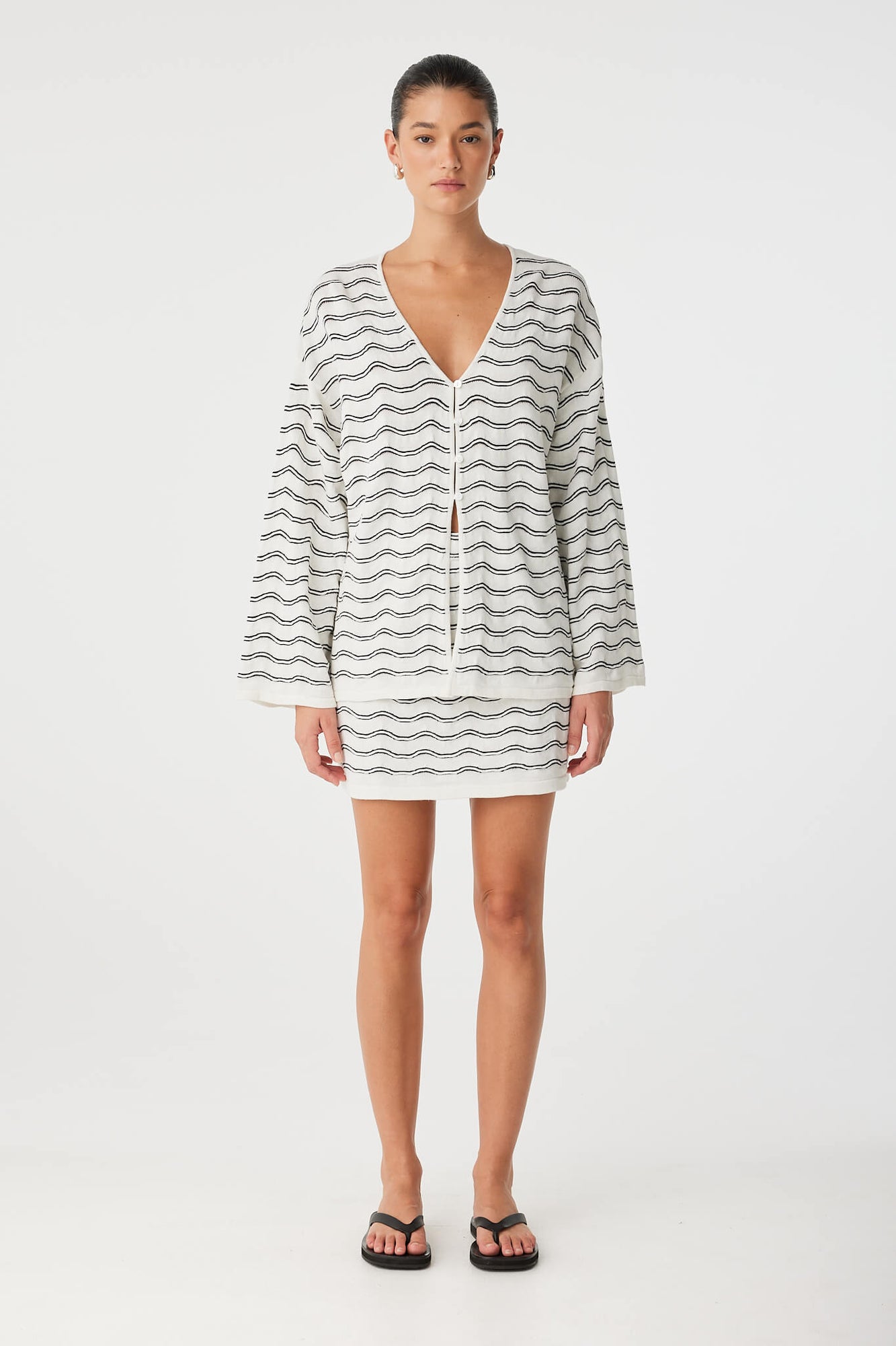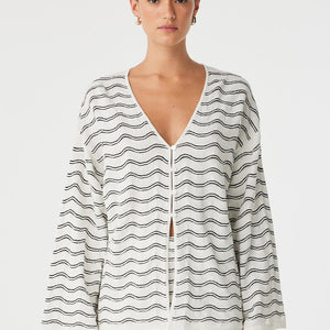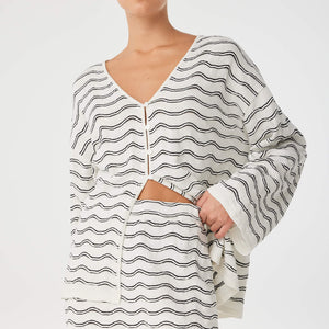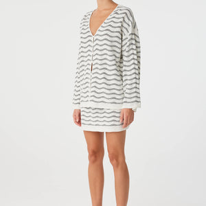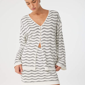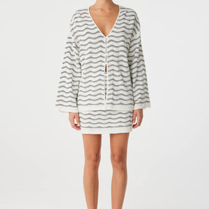 A relaxed button-front top with artisanal texture and coastal ease. The Onda Long Sleeve features wide sleeves, a V-neckline, and a delicate button-and-loop closure. Knitted in Arcaa’s signature wave motif with a breathable linen–cotton blend. Wear it open, closed, or layered with its matching skirt.
