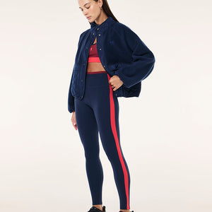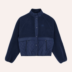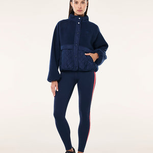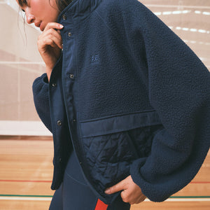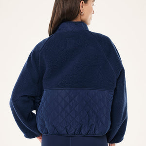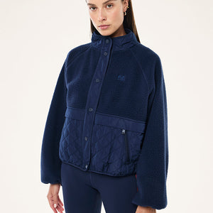 The Technique Quilt Jacket in Dark Navy is rendered in our Sherpa fabrication, delivering plush warmth with a softly structured feel for cooler conditions. Designed for gym mornings, mobility work and layered commutes, it anchors your transseasonal wardrobe. Combining soft-backed sherpa with contrast quilted spray panels, it features fabric binding at the cuff, neck and placket alongside snap closures for a clean, functional finish.